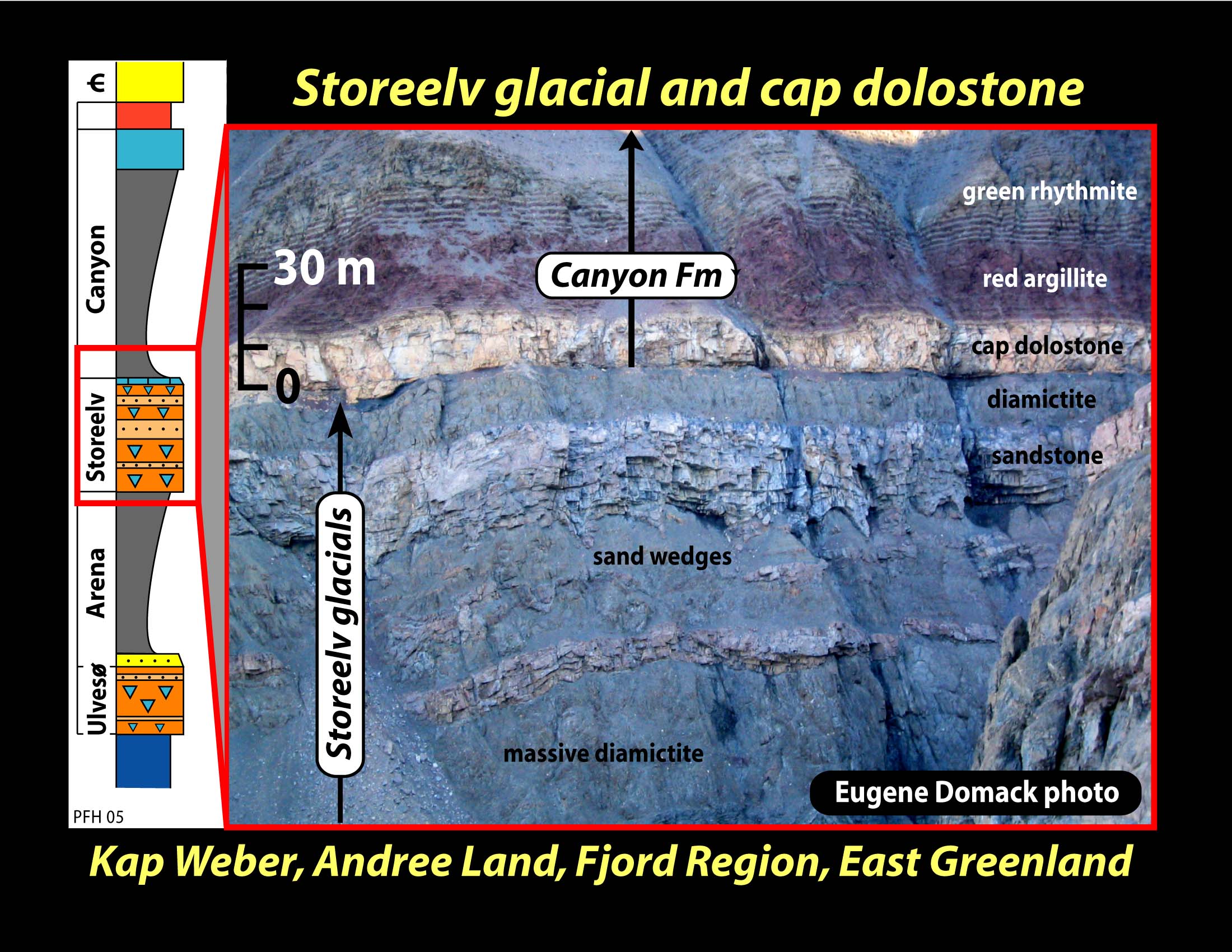 Storeelv glacial diamictite and basal Canyon cap dolostone in the Andrée
