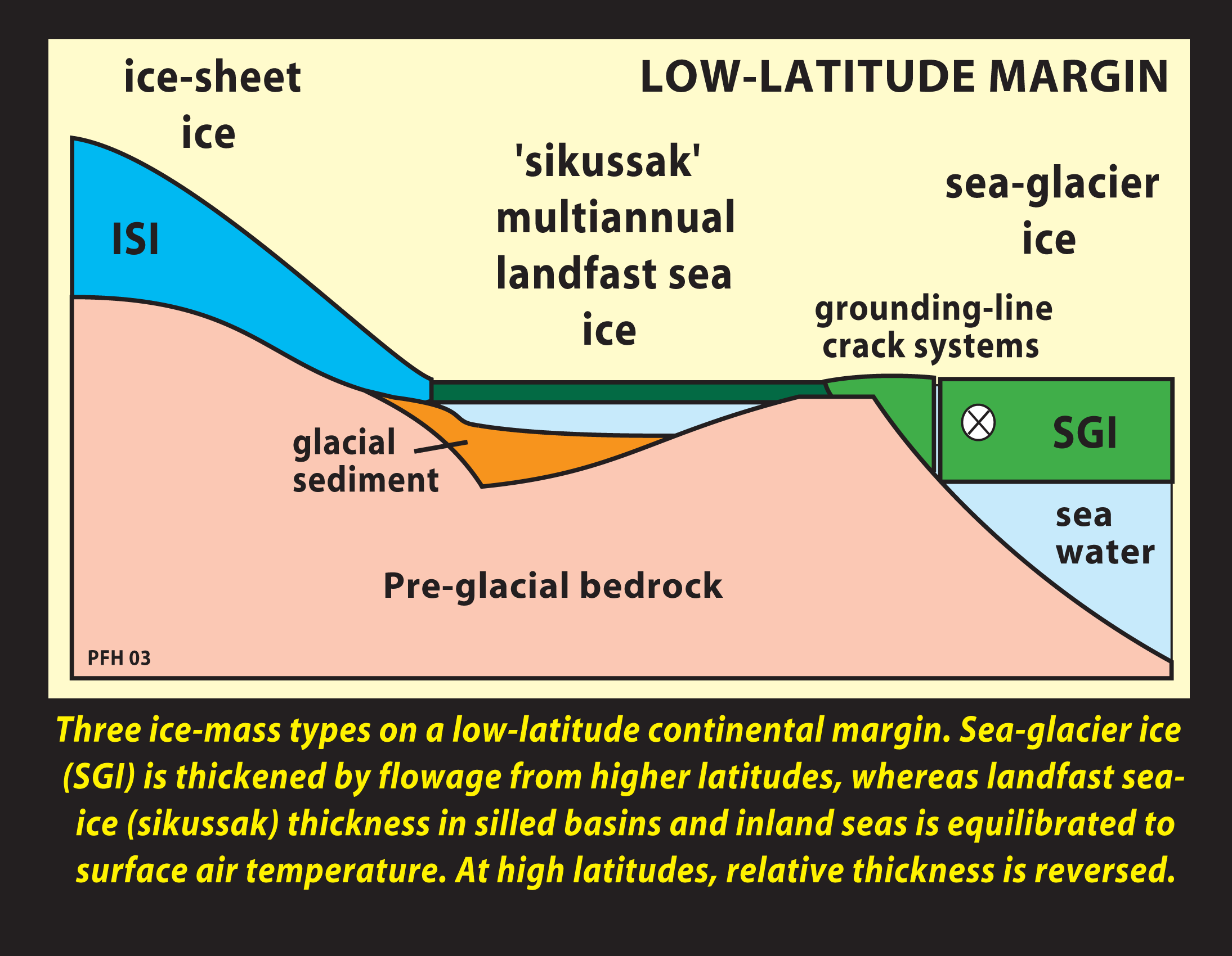 Three hypothetical ice-mass types—ice-sheet ice, sea-glacier ice,